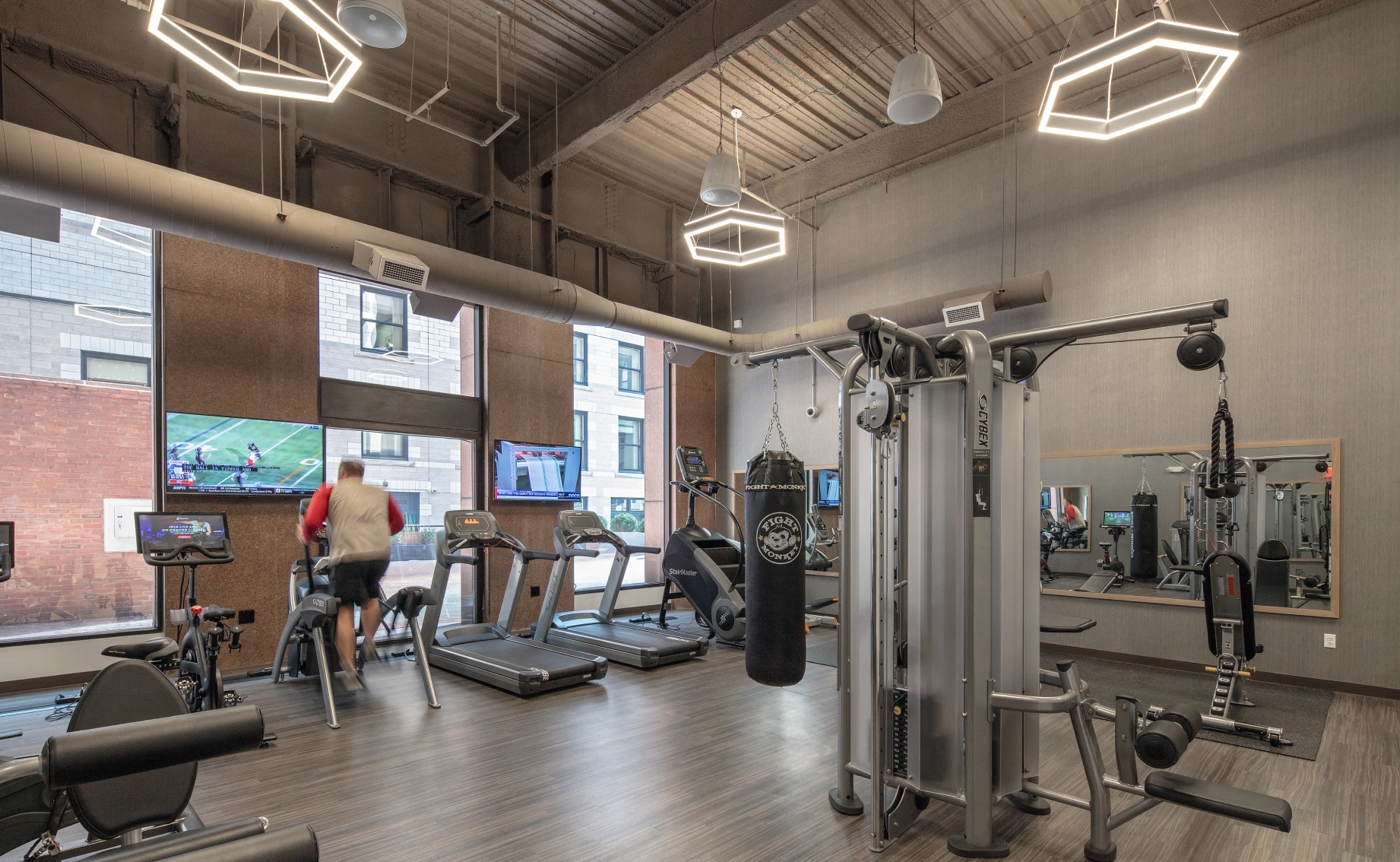 Amenities include a newly renovated fitness center and outdoor plaza, as well as bicycle storage.